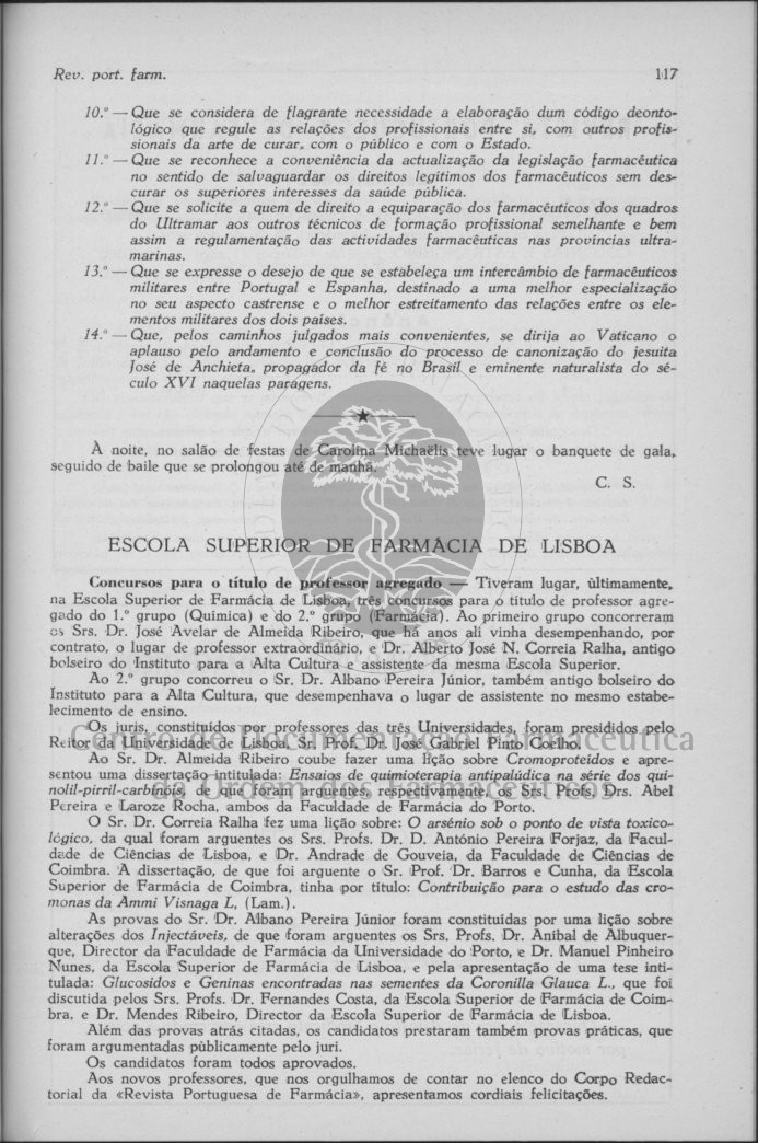 Obra Revista Portuguesa de Farmácia Cópia em JPEG Encadernação Digital [Rosto] Trabalhos Originais Revisões de Conjunto À Direcção e ao Corpo Redactorial da « Revista Portuguesa de Farmácia» [Rosto] Editorial Trabalhos Originais 54 Cromonas da Ammi Visnaga L. (LAM), A. J. C. Ralha Sobre a Preparação do Soluto Injectável de Vitamina C, A. Marques Leal, L. D. Rodrigues, S. Duarte Ferreira, J. A. Baltazar, Maria A. Andrade e Elisa Freitas Convite [Rosto] Trabalhos Originais 121 O P. A. S. Sódico como Estabilizante dos Injectáveis de Riboflavina, Aluísio Marques Leal, Maria Amélia Andrade e Maria de Lourdes Alves Nota Prévia sobre a Acção Circulatoria dos Alcaloides do Ptaeroxylon Obliquum (Thumb.) RADLK, A. C. Correia da Silva e L. Nogueira Prista [Rosto] Trabalhos Originais 161 Contribuição para a Determinação Química, Qualitativa e Quantitativa, do Brometo de Metantelina, J. A. de Almeida Baltazar e A. Lupi Nogueira Um Novo Método de Dosagem Fotocolorimétrica do P-Amino-Salicilato de Sódio, L. Duarte Rodrigues e R. Duarte Rodrigues Revisões de Conjunto Resumos Cooperam na obra desta Revista... [Contracapa] | Encadernação Digital > Secção Profissional > 117 |