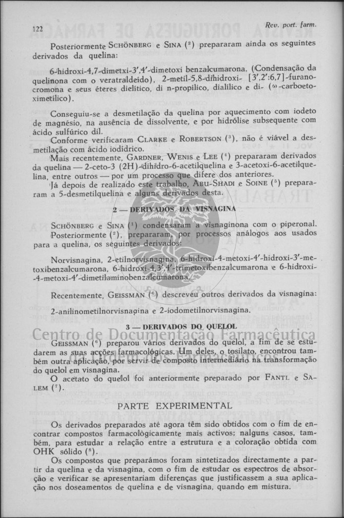 Obra Revista Portuguesa de Farmácia Cópia em JPEG Encadernação Digital [Rosto] Trabalhos Originais Revisões de Conjunto À Direcção e ao Corpo Redactorial da « Revista Portuguesa de Farmácia» [Rosto] Editorial Trabalhos Originais 54 Cromonas da Ammi Visnaga L. (LAM), A. J. C. Ralha Sobre a Preparação do Soluto Injectável de Vitamina C, A. Marques Leal, L. D. Rodrigues, S. Duarte Ferreira, J. A. Baltazar, Maria A. Andrade e Elisa Freitas Convite [Rosto] Trabalhos Originais 121 O P. A. S. Sódico como Estabilizante dos Injectáveis de Riboflavina, Aluísio Marques Leal, Maria Amélia Andrade e Maria de Lourdes Alves Nota Prévia sobre a Acção Circulatoria dos Alcaloides do Ptaeroxylon Obliquum (Thumb.) RADLK, A. C. Correia da Silva e L. Nogueira Prista [Rosto] Trabalhos Originais 161 Contribuição para a Determinação Química, Qualitativa e Quantitativa, do Brometo de Metantelina, J. A. de Almeida Baltazar e A. Lupi Nogueira Um Novo Método de Dosagem Fotocolorimétrica do P-Amino-Salicilato de Sódio, L. Duarte Rodrigues e R. Duarte Rodrigues Revisões de Conjunto Resumos Cooperam na obra desta Revista... [Contracapa] | Encadernação Digital > Trabalhos Originais > Estiril Derivados da Norquelina e da Norvisnagina, Alberto J. C. Ralha > 122 |