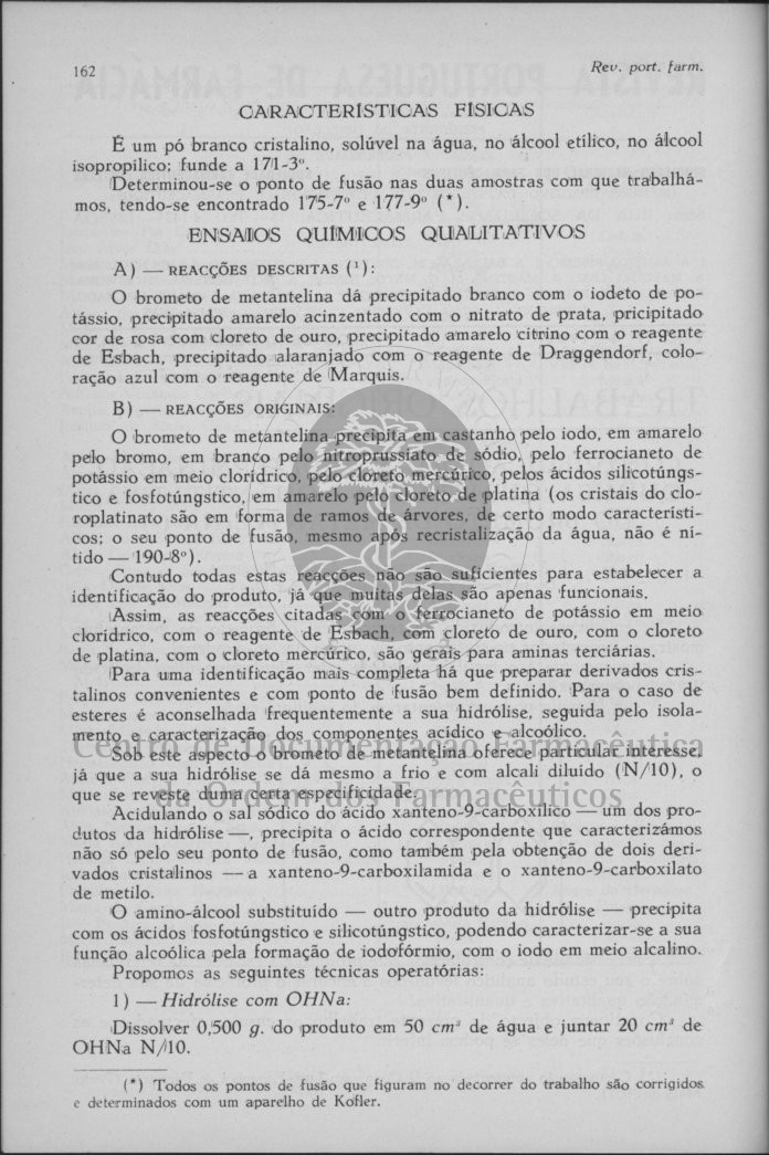 Obra Revista Portuguesa de Farmácia Cópia em JPEG Encadernação Digital [Rosto] Trabalhos Originais Revisões de Conjunto À Direcção e ao Corpo Redactorial da « Revista Portuguesa de Farmácia» [Rosto] Editorial Trabalhos Originais 54 Cromonas da Ammi Visnaga L. (LAM), A. J. C. Ralha Sobre a Preparação do Soluto Injectável de Vitamina C, A. Marques Leal, L. D. Rodrigues, S. Duarte Ferreira, J. A. Baltazar, Maria A. Andrade e Elisa Freitas Convite [Rosto] Trabalhos Originais 121 O P. A. S. Sódico como Estabilizante dos Injectáveis de Riboflavina, Aluísio Marques Leal, Maria Amélia Andrade e Maria de Lourdes Alves Nota Prévia sobre a Acção Circulatoria dos Alcaloides do Ptaeroxylon Obliquum (Thumb.) RADLK, A. C. Correia da Silva e L. Nogueira Prista [Rosto] Trabalhos Originais 161 Contribuição para a Determinação Química, Qualitativa e Quantitativa, do Brometo de Metantelina, J. A. de Almeida Baltazar e A. Lupi Nogueira Um Novo Método de Dosagem Fotocolorimétrica do P-Amino-Salicilato de Sódio, L. Duarte Rodrigues e R. Duarte Rodrigues Revisões de Conjunto Resumos Cooperam na obra desta Revista... [Contracapa] | Encadernação Digital > Trabalhos Originais > Contribuição para a Determinação Química, Qualitativa e Quantitativa, do Brometo de Metantelina, J. A. de Almeida Baltazar e A. Lupi Nogueira > 162 |