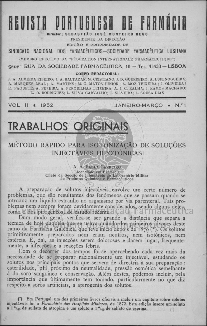Obra Revista Portuguesa de Farmácia Cópia em JPEG Encadernação Digital [Rosto] Trabalhos Originais Revisões de Conjunto À Direcção e ao Corpo Redactorial da « Revista Portuguesa de Farmácia» [Rosto] Editorial Trabalhos Originais 54 Cromonas da Ammi Visnaga L. (LAM), A. J. C. Ralha Sobre a Preparação do Soluto Injectável de Vitamina C, A. Marques Leal, L. D. Rodrigues, S. Duarte Ferreira, J. A. Baltazar, Maria A. Andrade e Elisa Freitas Convite [Rosto] Trabalhos Originais 121 O P. A. S. Sódico como Estabilizante dos Injectáveis de Riboflavina, Aluísio Marques Leal, Maria Amélia Andrade e Maria de Lourdes Alves Nota Prévia sobre a Acção Circulatoria dos Alcaloides do Ptaeroxylon Obliquum (Thumb.) RADLK, A. C. Correia da Silva e L. Nogueira Prista [Rosto] Trabalhos Originais 161 Contribuição para a Determinação Química, Qualitativa e Quantitativa, do Brometo de Metantelina, J. A. de Almeida Baltazar e A. Lupi Nogueira Um Novo Método de Dosagem Fotocolorimétrica do P-Amino-Salicilato de Sódio, L. Duarte Rodrigues e R. Duarte Rodrigues Revisões de Conjunto Resumos Cooperam na obra desta Revista... [Contracapa] | Encadernação Digital > [Rosto] > 1 |